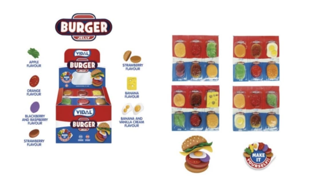Confiserie gélifiée, lisse en forme de différents composant, pour former un burger d'environ 67grs.