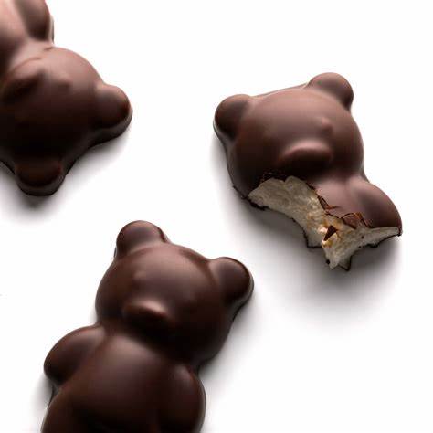 Guimauves en forme d'oursons, enrobées de chocolat noir.
